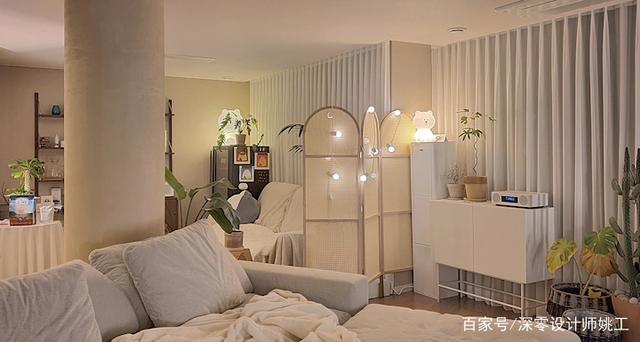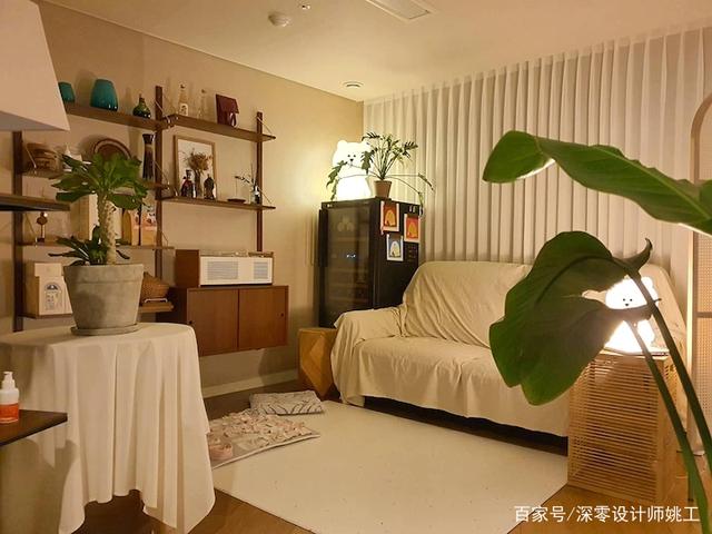 正因为户型的不规则,反而让这个家魅力十足,旁边屏风一隔,立马又多一个小客厅,女屋主会经常窝在这里刷刷视频看看书听听音乐,把平凡的小生活过得非常有仪式感和精致。