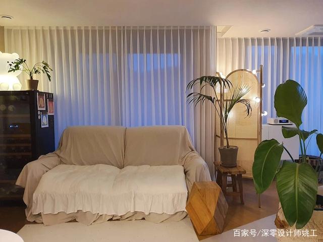 非常赞同女屋主的这个省钱小妙招,对于客厅这种私密性不需要特强的空间,窗帘直接选择一层纱帘即可~