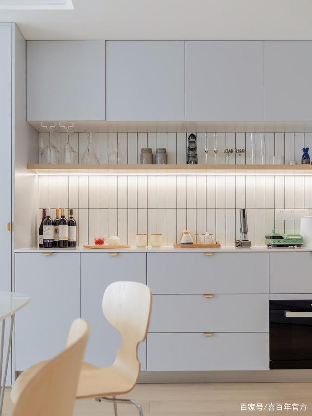 西厨区既是水吧台也可以作为烘焙的地方,柜子下方嵌入烤箱,台面上储放各类小家电满足生活需求,这种白色柜子看起来真的太舒服了,把手设计也特别,操作台上方嵌入灯带照明,增加光线。