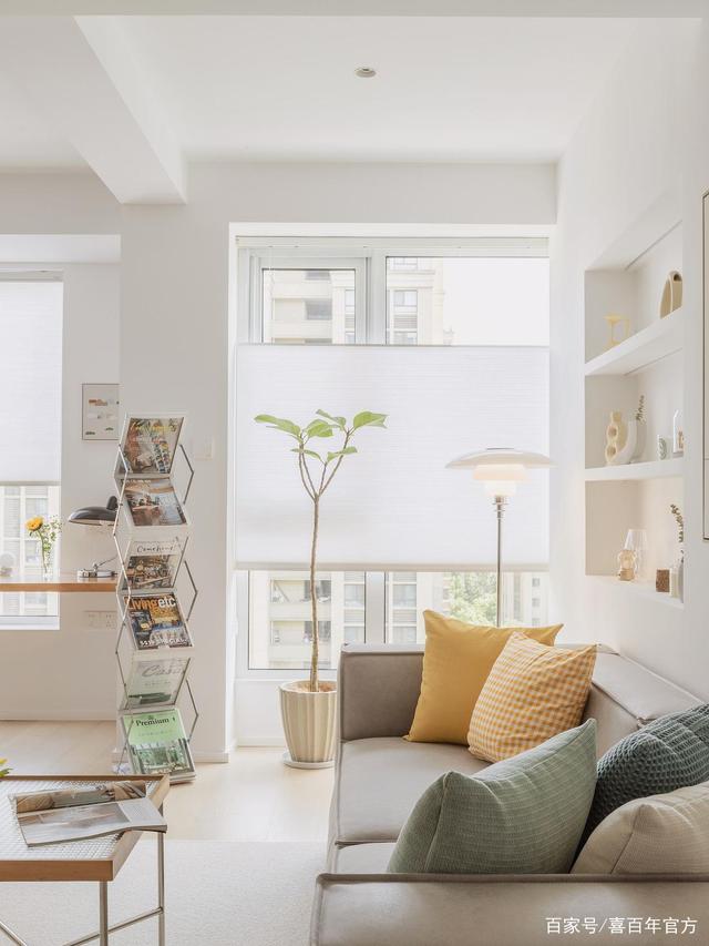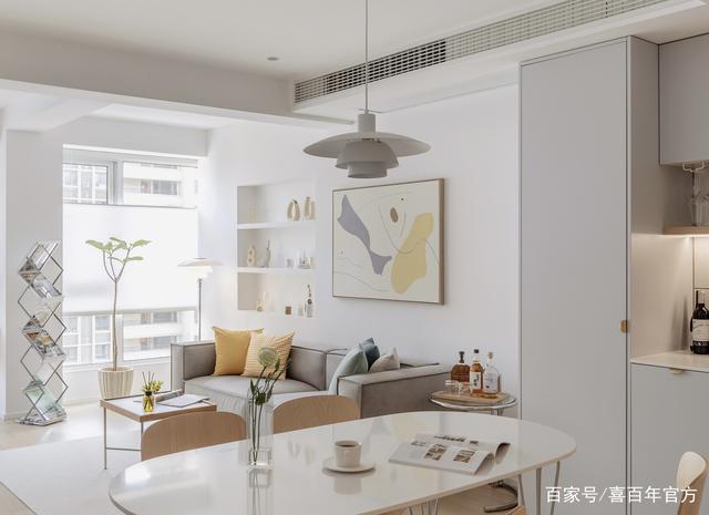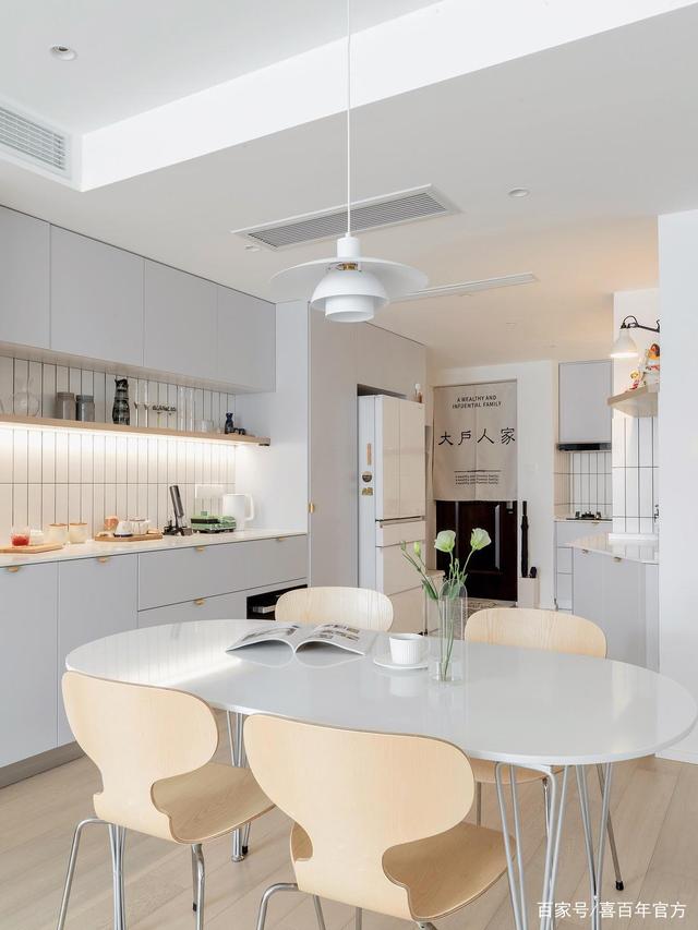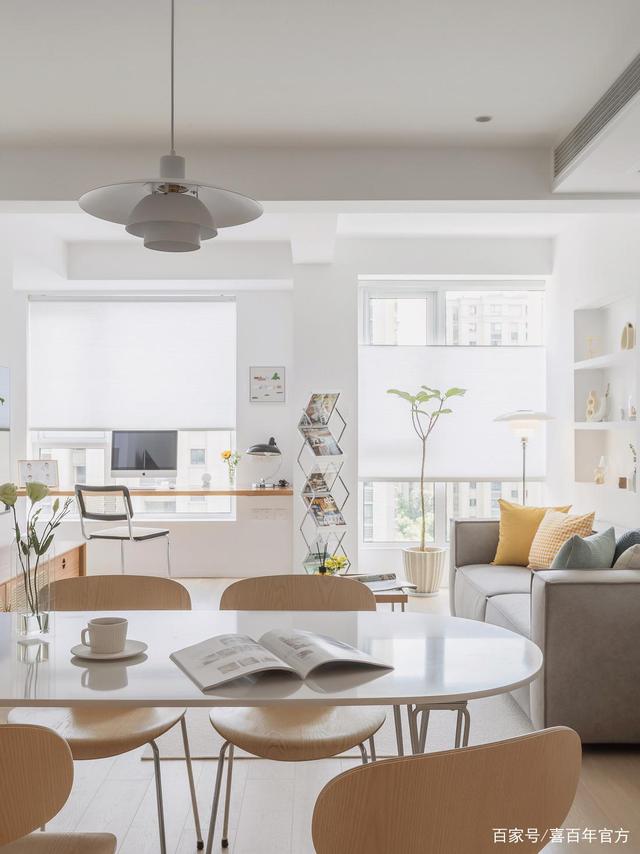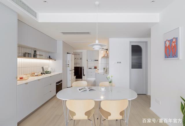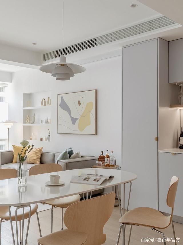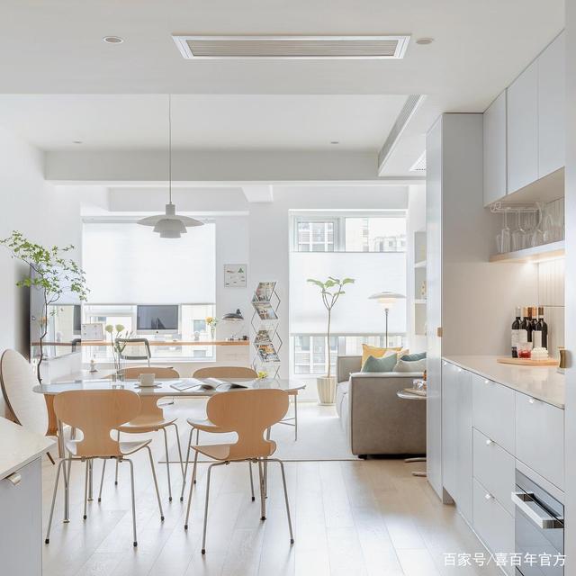 进门后就是客餐厅和西厨区,这种白色质地加上暖色调的点缀真的太治愈了,落地窗带来充足的光线,日出和午后的暖阳倾洒进客厅,在每样家具上跳跃。