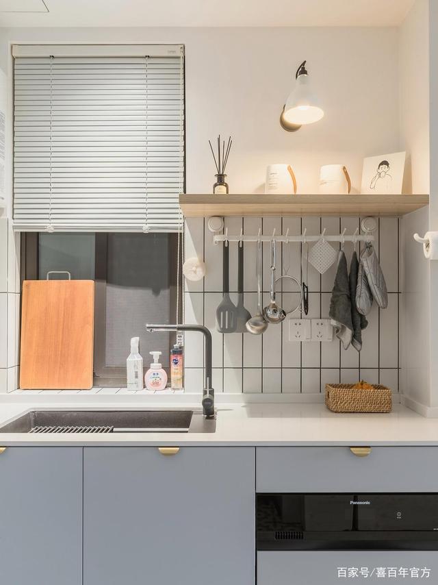 厨房洗漱池一角,厨房选用淡蓝色的橱柜搭配小白砖清新感十足,墙面设计了置物板和挂钩放一些小物件使用更便捷。