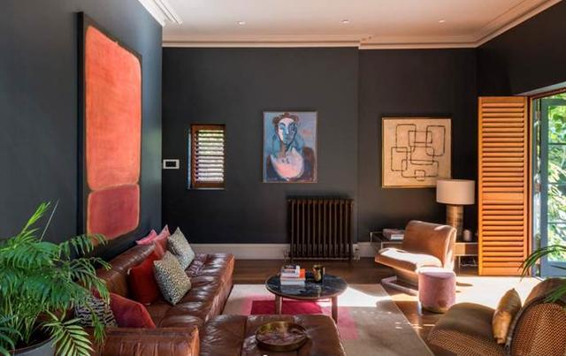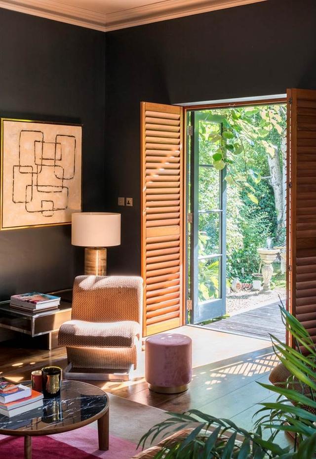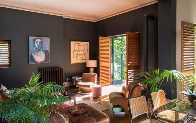 餐厅的色彩比客厅会更深一些,在这个区域内,我们可以看到黑色餐厅背景墙和玄关柜。大面积的黑色基底,搭配中古餐桌椅,赋予了餐厅深刻的艺术感。