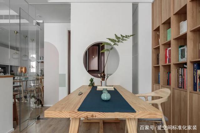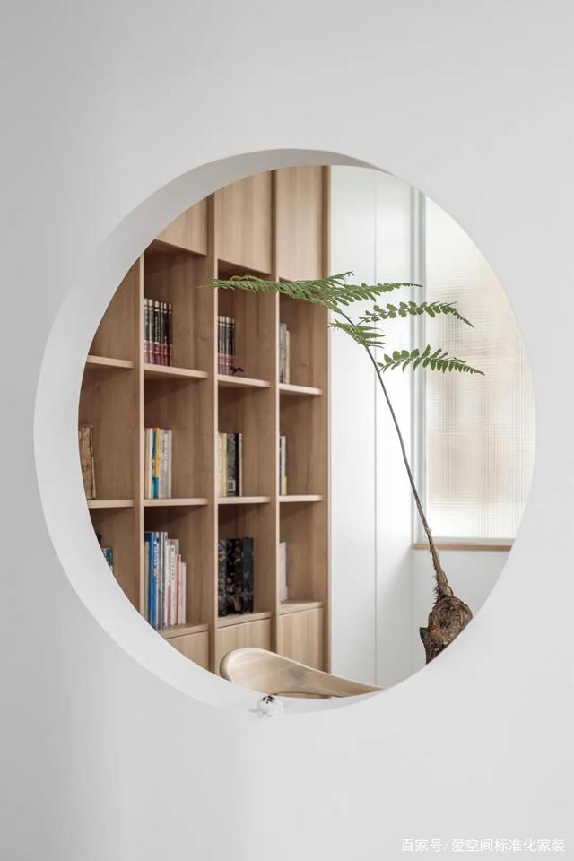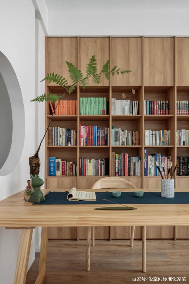 女主给每一格空间都做了清晰的分类,中国古诗词、世界名著、现代小说、人物传记、艺术画册以及夫妻俩的专业书籍等等,都进行了分列排布,呈现出整齐舒适的美感,同时又方便检索,前方配套一张原木书桌,颇有中式韵味。