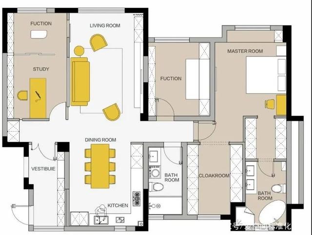 户型分析:房子原始布局还算合理,但对于屋主来说,爱宠也是他们生活很重要的一部分,必须有容身之处,于是在家装前期对户型进行了合理调整,具体如下: