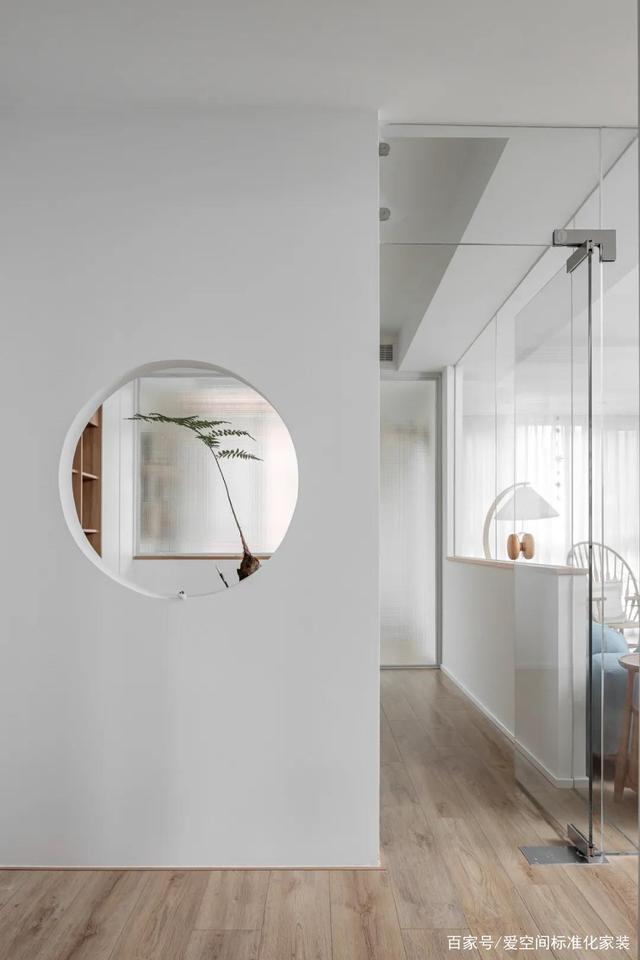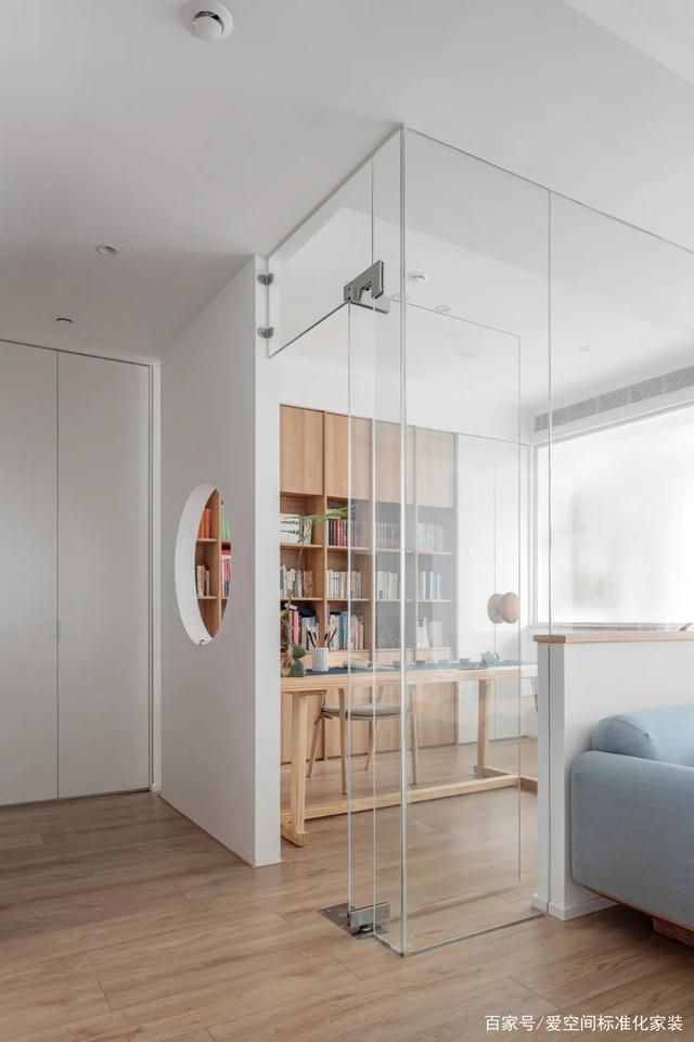 1.将原户型次卧墙体拆除,向内10cm重新打造一块墙体,并镂空设计为玄关端景,同时更改门洞位置。其他墙体采用玻璃材质,规划成一个半开放式书房,增强了空间通透性和互动感;