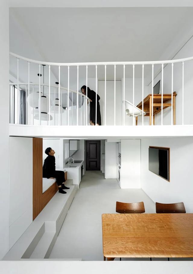 设计师在充分考虑居住人口的隐私关系后,利用原始结构地台,将沙发做成了一个具有单人床尺度的休息区,沙发旁边还隐藏着封闭小卧室,为母女二人长期的共同居住提供了可能。
