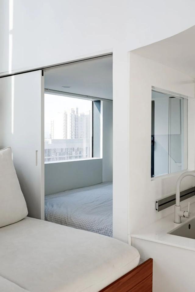 旁边还隐藏了一个可以独立封闭的小卧室,用白色推拉门做隔断,这是沙发地台的延伸,为母亲提供可以长期居住的睡眠空间。