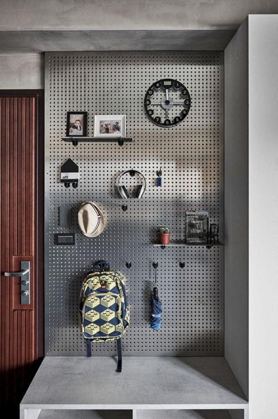 接受程度更高的,可以考虑洞洞板,尤其是玄关比较窄,又没条件做储物间的,整面洞洞板上墙,用短杆和隔断也能收纳不少的杂物。