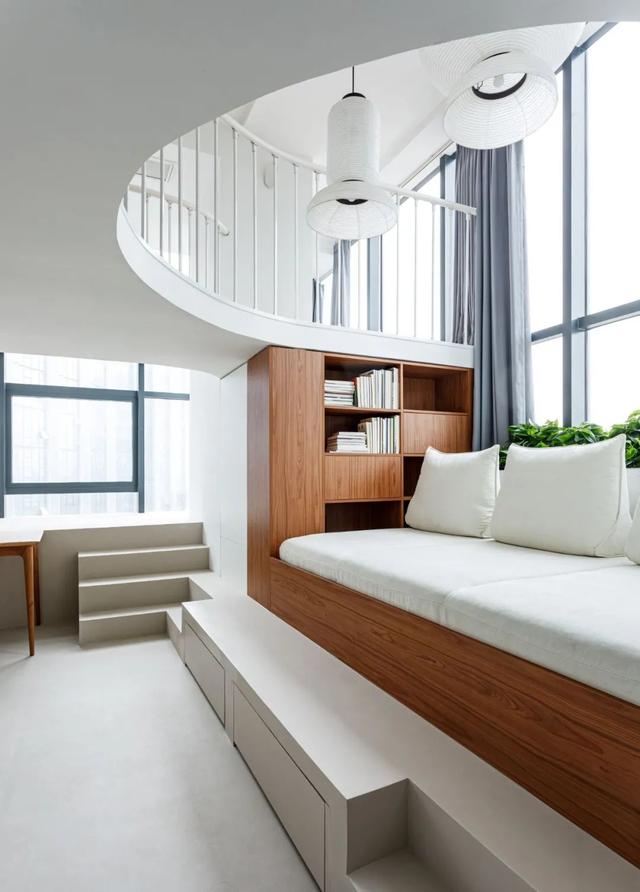 设计师以桥梁为灵感,没有像大多loft一样追求花哨的楼梯,而是将通向二层的楼梯隐藏在柱体后方,削弱了楼梯的存在感。