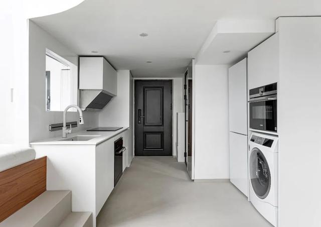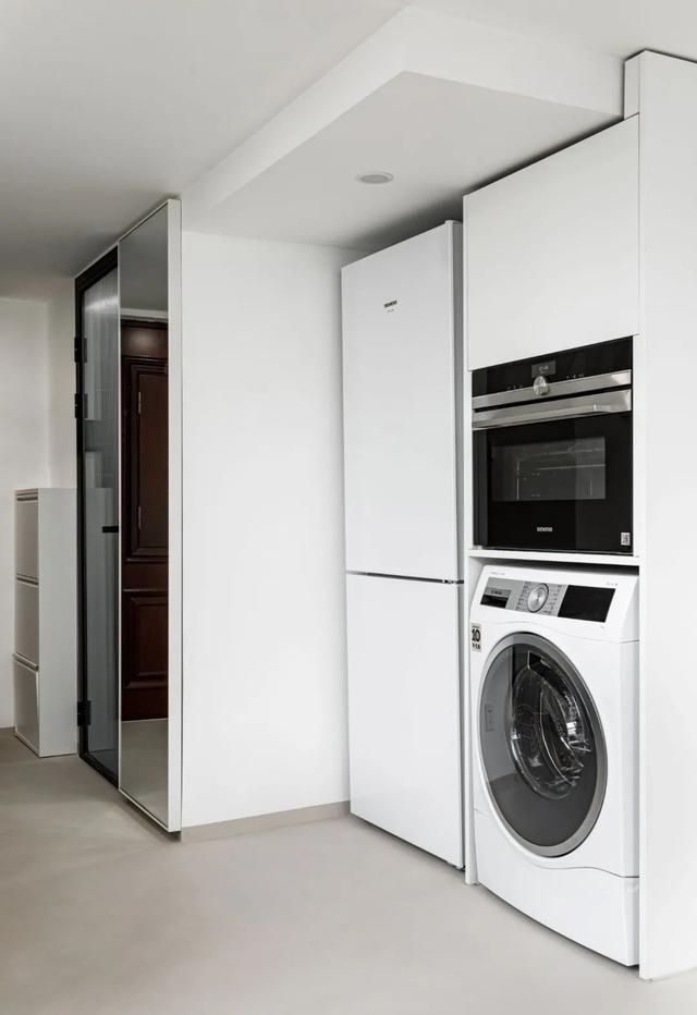另一侧是一组高柜,洗衣机、烤箱、冰箱全部内嵌于此,顶部还拥有一处储物空间。