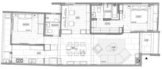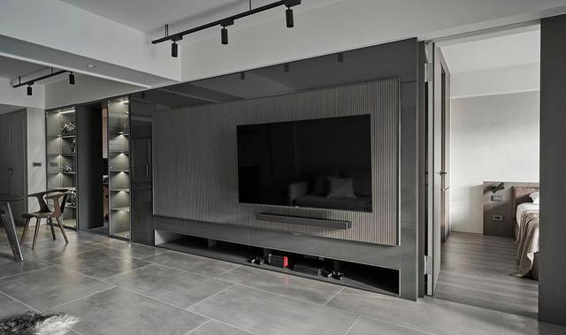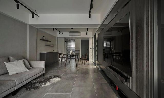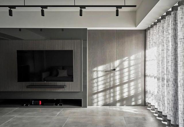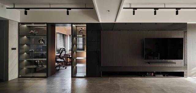 - 平面设计图,由于原始的客餐厅完全仰赖客厅的阳台采光,然而长条型的户型不利于光线的抵达,为了让室内空间有更多的自然光线,敲掉了与餐厅交接的厨房、书房的室内墙,门的方向更改成朝餐厅的方向。 - 同时,厨房的推拉门用长虹玻璃,具有透光而不透视的高级感;而书房则用玻璃展柜做“墙”,增加了两个方向的光,以此照亮了阴暗用餐区。  - 客厅空间 - 电视背景墙与主卧共用一面墙,背景墙主要用木格栅装饰,质朴简洁很耐看,木格栅下方挖墙体做了“壁龛”,用来摆放游戏设备、音响等物品。  - 客餐厅中间有大横梁,这里做了内嵌筒灯和石膏板装饰,对比白色天花,弱化了大梁的压迫感。  - 客厅的茶几被弱化了,让沙发与电视背景墙之间的空间空出来,可以席地而坐,可以背靠沙发而坐等等,更为自由。   - 电视背景墙与书房柜墙的全景图,天花板上的滑轨射灯,可以聚焦灯光,让物品更为鲜亮美观。  - 沙发背景墙与餐厅背景墙的全景图,刷同一色调的乳胶漆,整体协调美观。