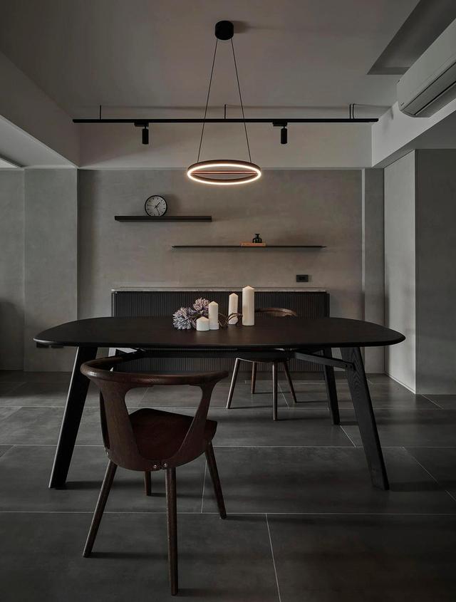 - 餐厅做了一排的收纳柜,收纳小家电和餐厨用品,并且长条形的台面不仅置物方便,偶尔也可以作为操作台,做轻食、手工等等。 - 另外餐厅一盏圆形的吊线灯,散发着轻柔的黄光,衬映了餐厅圆润的桌椅线条,营造简而不单的就餐氛围。   - 厨房空间 - 厨房用长虹玻璃滑门弹性阻隔油烟,亦引进相互照映的明亮光感,改善餐区光线之余,也串起了餐厨交流,增加互动。