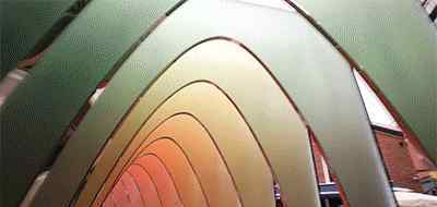 该装置由颜色不断变化的彩色阳光板组成,装置内部是一个高度和宽度不断变化的拱顶,向前延伸,连续形成一个环。连续而有节奏的阳光板像潮水一样一个接一个退去,像在爱情的前奏中行走。通过空之间的高低变化,形成男女有别的行走体验序曲部分。