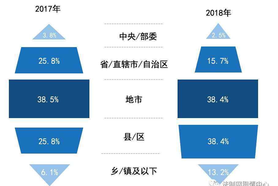 从事件级别来看,地级和县级占比最高,均为38.4%;省、直辖市、自治区占15.7%;乡及以下,中央或部委分别占13.2%和2.3%。与2017年相比,县级、乡级及以下的比例明显增加,意味着更多的舆情事件向县级及以下下沉,考验基层部门的舆情处理能力。