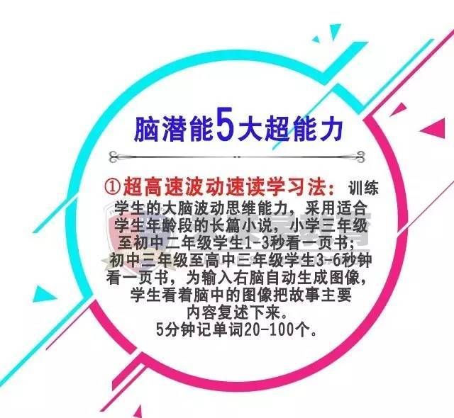 脑潜能开发十分注重右脑开发,专注提升孩子的注意力、记忆力、想象力、理解力和公众演说能力。通过开发脑力,挖掘潜力,让孩子掌握更加科学合理的学习方法,提高孩子的学习效率,找到学习上的成就感和优越感!