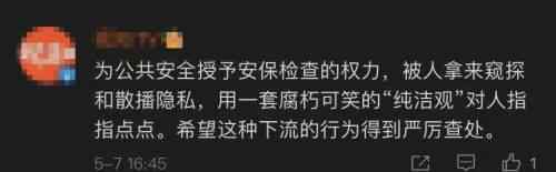 该网友表示,“一些恶劣的安检拍摄乘客的隐私物品并将其散播到其他平台还对乘客评头论足,且不说安检工作的时候能不能玩手机,这种玩笑心态的低素质人真的可以充当地铁安检的职位吗?凭什么你就能拍摄乘客的私人物品并且配上不当言论?”