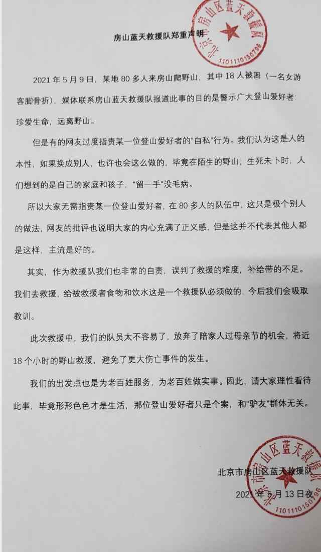 5月13日晚,房山蓝天救援队回应此事,认为这是极个别人的行为,也是人之常情,希望网友不要过度指责,“作为救援队我们也非常的自责,误判了救援的难度,补给带的不足。”