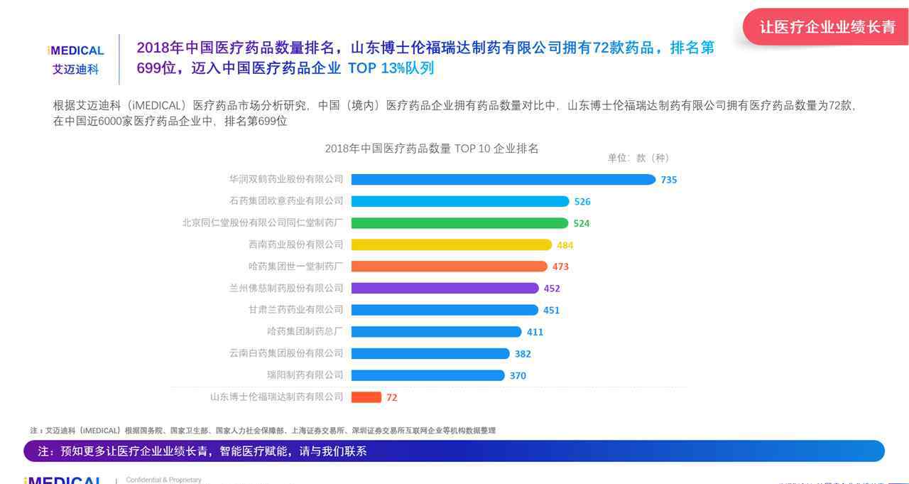 在2018年中国医药药品数量排名中,山东博世伦弗雷达药业有限公司拥有药品72种,排名第699位,已进入中国医药企业前13%的队列