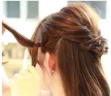 第六步:将左耳前的头发分成两股,拧成两条辫子。如图。