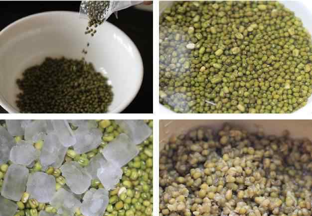3.正常版本:在常规炖锅中加入水、绿豆、冰糖,调至高热。烧开关火。静置20分钟,调中火,再煮20-30分钟,直到绿豆开花。加入盐,静置,冷却。可以吃。