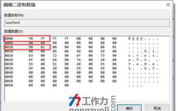 在右边找到图标字体,双击或右键修改。请注意,只有0000和0010之后的值会被修改。Windows默认字体大小为9号,经过劳动力测试后,改成12号最合适。
