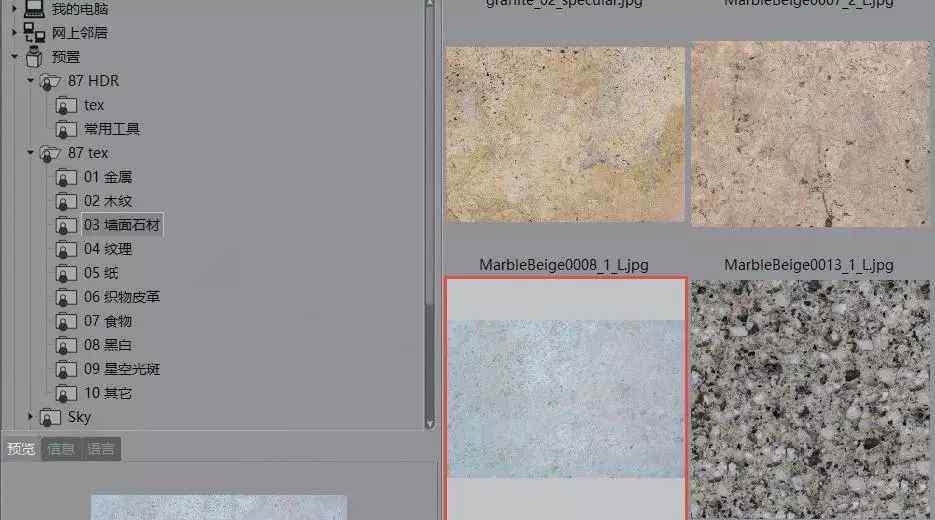 02在87 tex中找到“03墙石”的纹理贴图,然后加载到材质“凹凸”选项的“纹理”通道中,形成精细的划痕细节,如图1和图2所示。