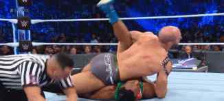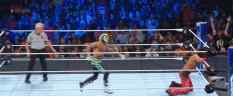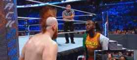 接下来,希莫斯和塞萨尔为大E使用了一套组合技巧,希莫斯在压制时把脚放在了边绳上。科菲看到希莫斯的犯规动作,立即阻止了他
