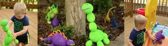 在彩纸上画出恐龙的四肢和尾巴,剪下来,贴在氢气球上,恐龙就可以飞了。很多不同颜色的恐龙一起飞也是非常壮观的!