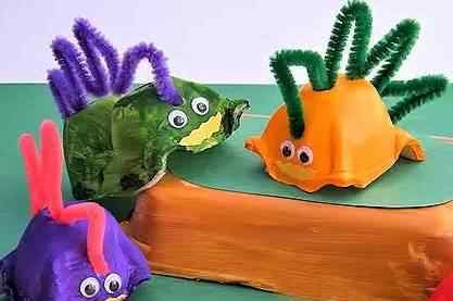 将蛋盒切割成恐龙的身体,将发根折叠成如图所示的形状,并固定在背部,作为恐龙的骨板或脊柱。最后把眼睛和嘴巴粘上,小恐龙就准备好了。