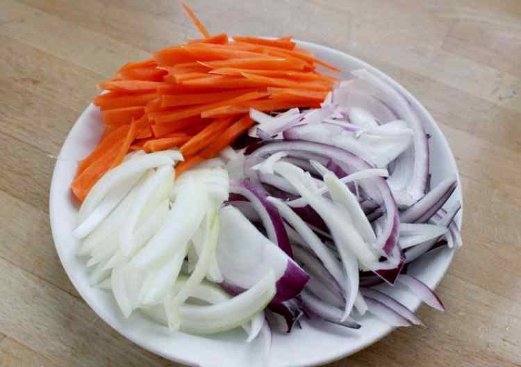 3 红、白洋葱和胡萝卜切丝。