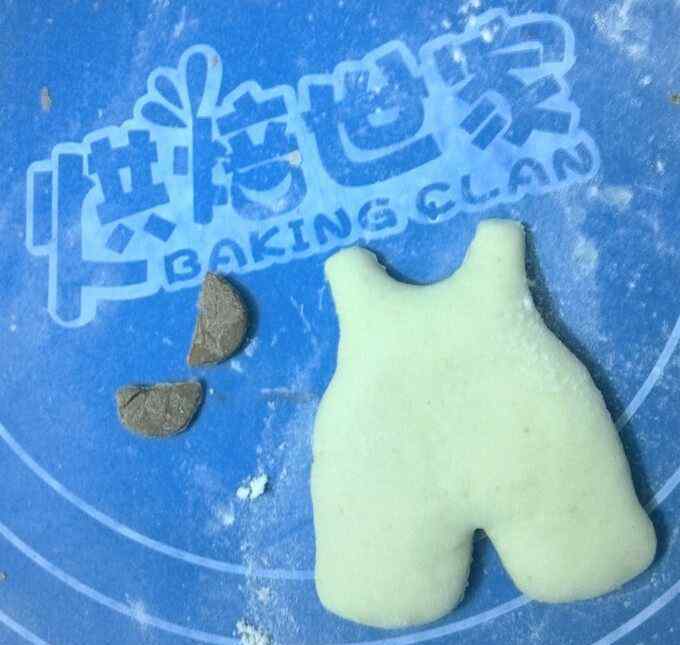 7 做出掉带裤形状,再揉一个圆形状切半做出下口袋。