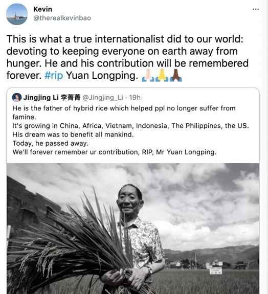 原标题:世界网友悼念袁隆平去世:贡献了自己的一生让全世界人民免于饥饿