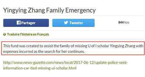 中国众筹网站GoFundMe的章莹颖筹款页面是由伊利诺伊大学香槟分校于6月17日设立的,目的是支付章莹颖家庭成员在美国寻找人的费用。捐款的最初目标是15,000美元,然后筹款目标调整为150,000美元。截至7月14日,已有3160人捐款,总额达130865美元。
