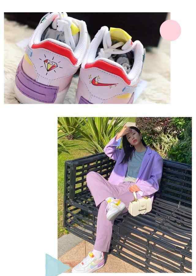 周予同脚上这双水晶底的粉紫色也超级辣。鞋子末端的DIA和耐克的标志鸳鸯非常聪明。整双鞋又甜又甜。