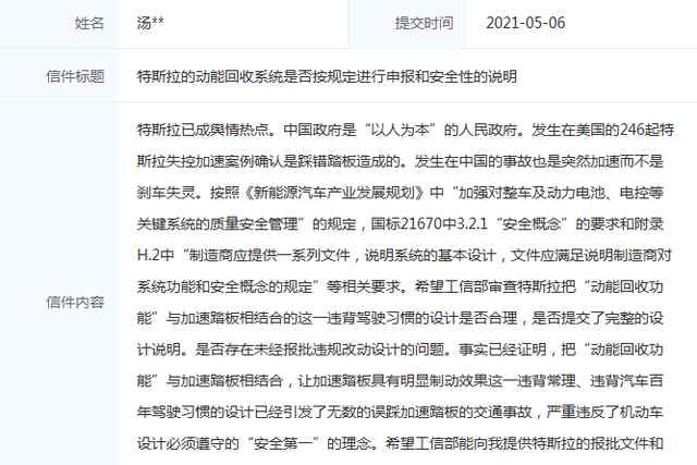 近日,有网友就“特斯拉的动能回收系统是否按规定进行申报和安全性”向工信部提交信件。