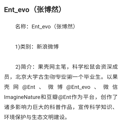 @Ent_evo是谁?有网友扒出了这个“Ent_evo”的底细:711分的高考状元;北大古生物学博士;国内知名科普内容团体,科学松鼠会会员;