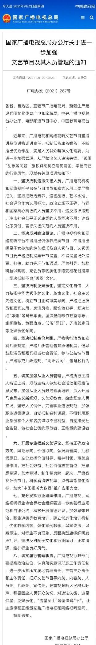 (自媒体/大米有文化)九月二日,国家广播电视总局发布从严整治艺人违法失德、“饭圈”乱象等问题的通知,这个通知立刻引发了娱乐业的震动。全文一共八条,可以说是娱乐圈的“八项规定”
