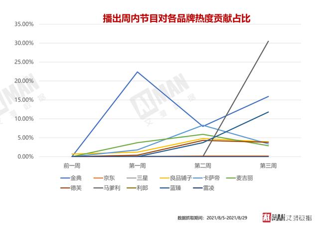 最大限度的曝光转化成了热度。根据艾漫数据,播出前两周,节目对金典的热度贡献占比始终高于其他品牌。第三周发生了变化,节目对新赞助商马爹利的热度贡献占比超过30%。