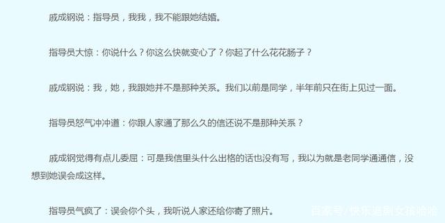 四美不远千里追爱到边疆,戚成钢的态度却非常淡漠。原著小说中戚成钢和指导员的对话,直接暴露他的渣男属性,两人暧昧不清的通信在戚成钢眼里是同学之间的“正常”往来。
