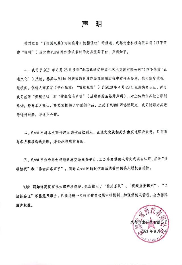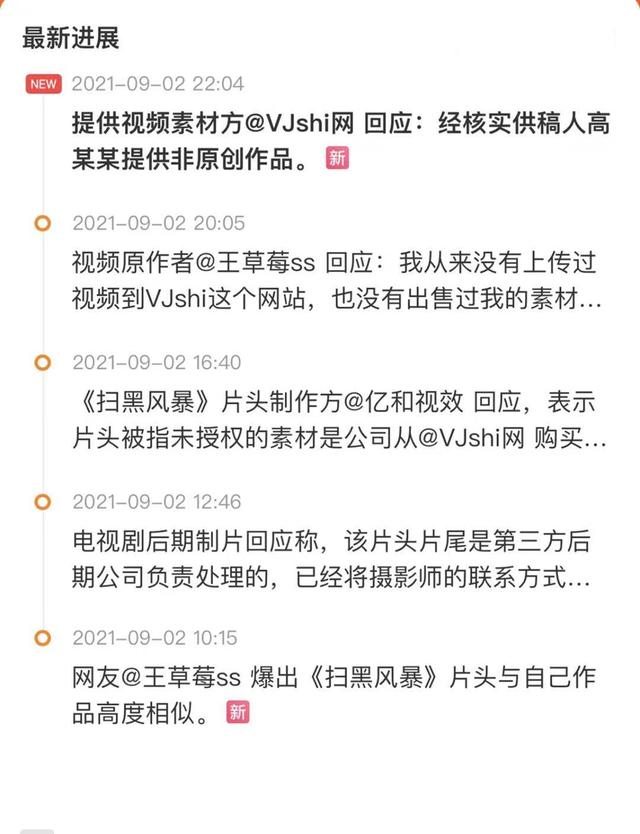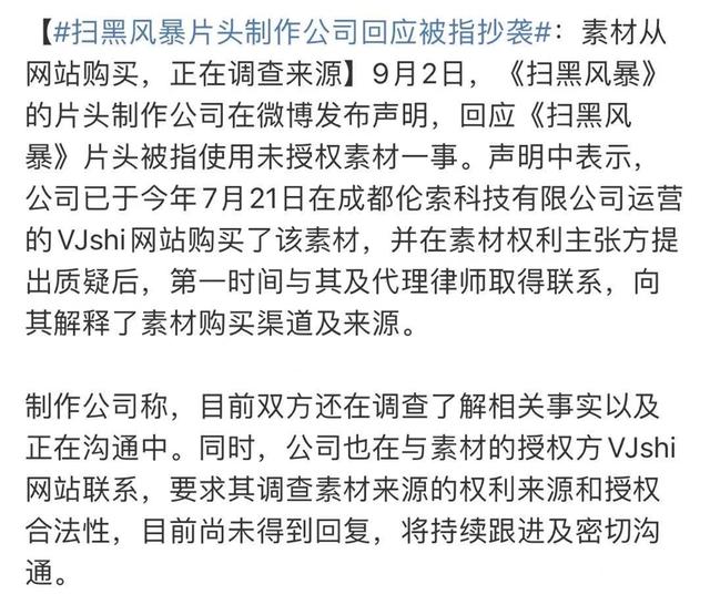 2.《《扫黑风暴》片头涉抄袭后续:VJshi网发布道歉声明,是供稿人的错》仅供读者参考,本网站未对该内容进行证实,对其原创性、真实性、完整性、及时性不作任何保证。