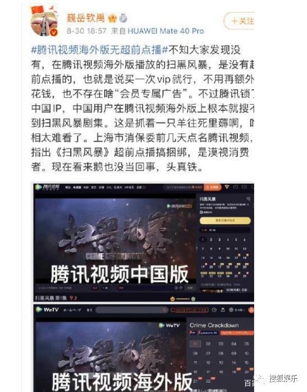 该网友还称腾讯锁了中国IP,中国用户在腾讯视频海外版上根本就搜不到《扫黑风暴》剧集。