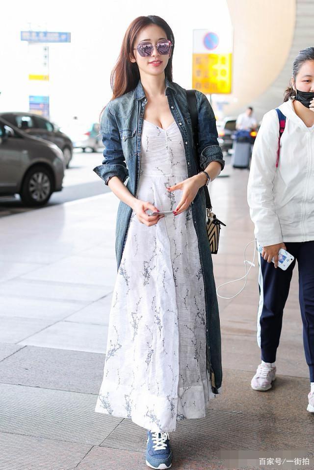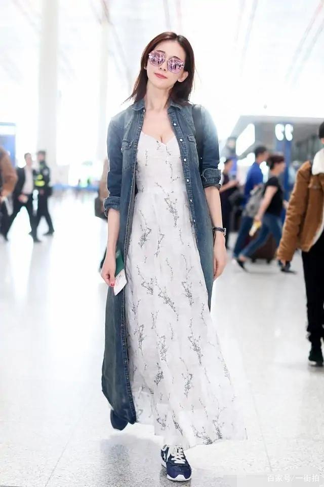 这款穿搭相对于上面那款就更加显女人味,内搭是一件白色印花的连衣裙,白色的配色很适合春夏季穿搭,结合上花型设计,让这款连衣裙更加具有设计亮点,也更加能凸显女人精致的一面,这样一来这款连衣裙也不会给人太过单调的效果。外搭上,林志玲搭配的是一件蓝色牛仔外套,这款牛仔外套衣长还特别的长,相对于短款的牛仔外套来说,会更加具有设计感,更加的独特有亮点,同时长款的款式也把林志玲高挑的身材都呈现出来,整个人看起来是又美身材又好,女神状态还是非常在线的!