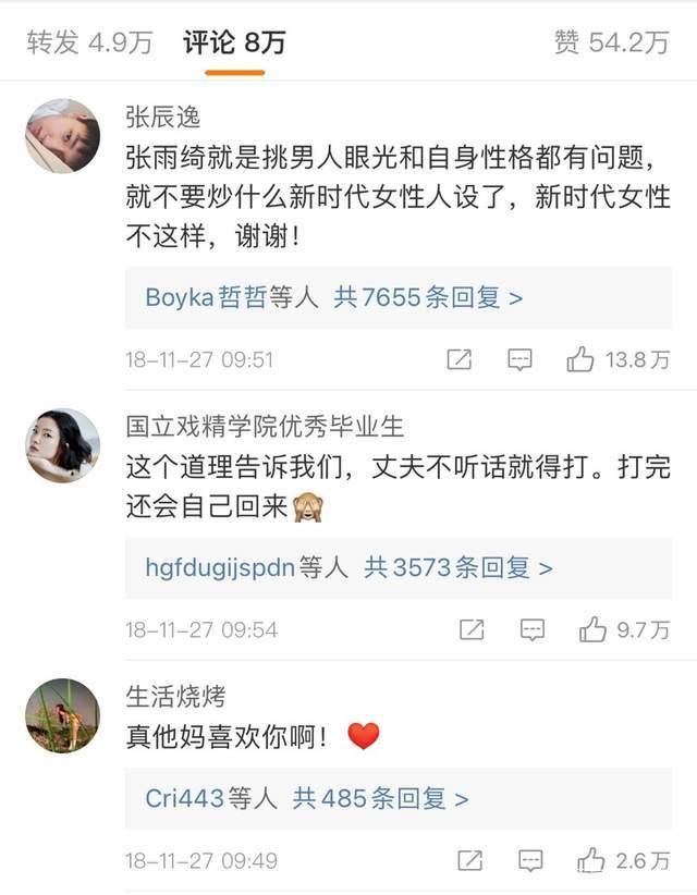 此后不到一年,2018年的9月份,她又被爆出挥舞大刀与郎共武,而此时,正好处在女权高涨、离婚潮爆发的时期,张雨绮变成了扛起女权大旗的英雄人物。