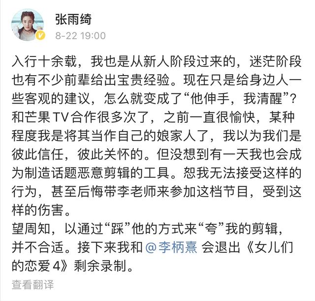 前段时间,张雨绮退出了一档恋爱综艺节目,理由是节目组恶意剪辑。