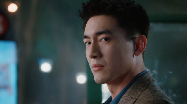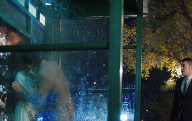 女主夏浅与男主盛哲宁在夜晚的公交车站避雨,背后的站牌是盛哲宁的海报,凸显男女主的身份悬殊,一辆车飞驰而过,盛哲宁为了保护夏浅不被水溅,一把拉过夏浅,转着圈的就亲上了!