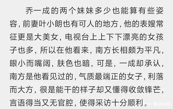首先先从形象上来分析。原著中项南方外表并不出色,作者对她的描写是长相颇为平凡,眼小而嘴阔,肤色也暗,但是却是乔一成见过的气质最端庄的女子,利落而大方。