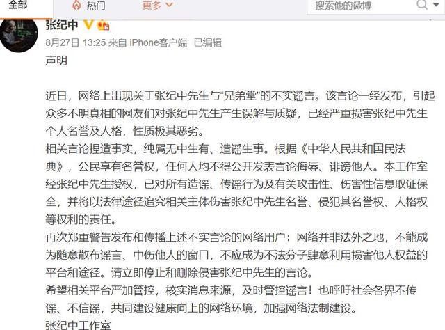 张纪中更是发布紧急声明,来彻底撇清与兄弟堂的关系。