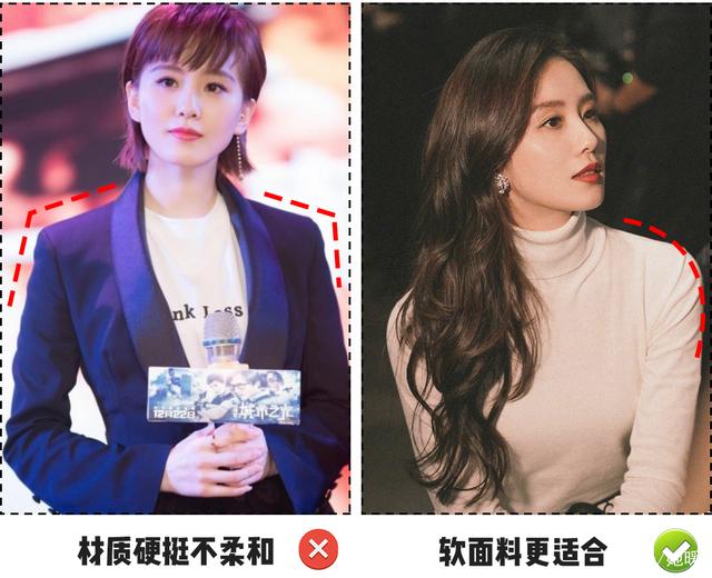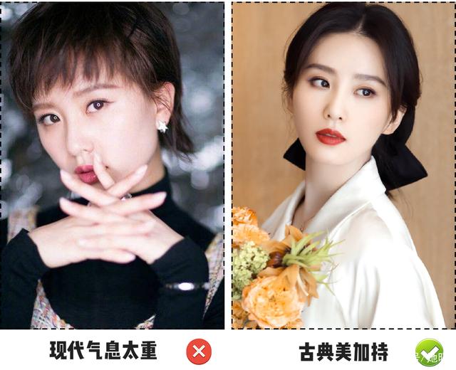 比如刘诗诗就很适合古典路线。她在平时的妆发和穿搭上就会融入点古典的气息,是不是明显右边这种柔和、温婉的气质更适合她?