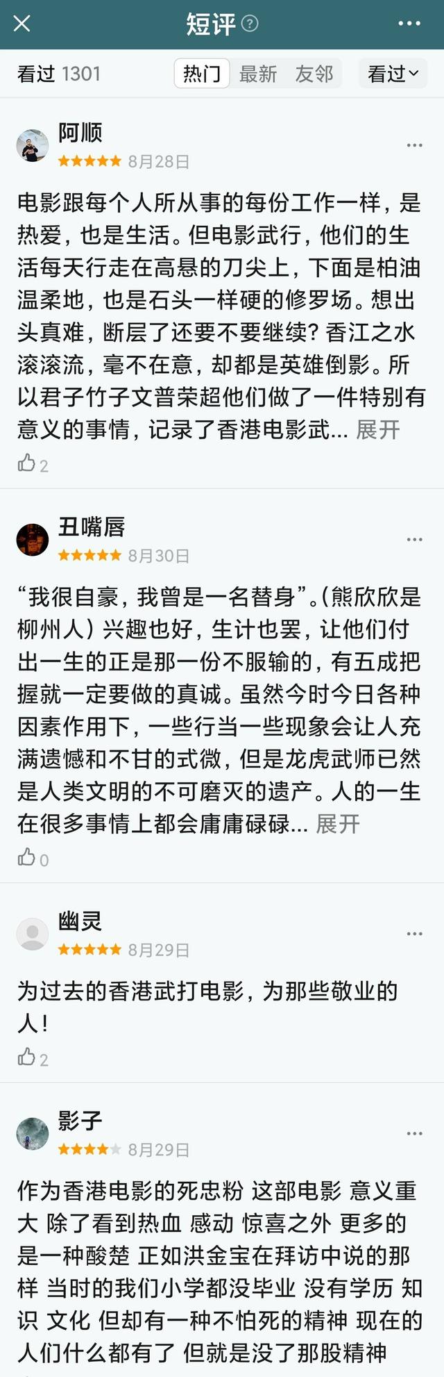 很多豆瓣网友给《龙虎武师》打了满分五星