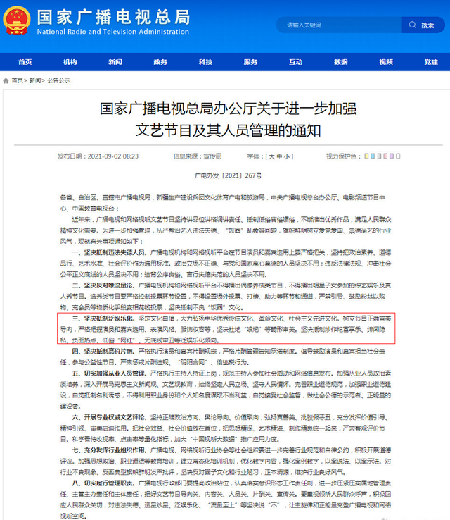 随后没多久的時间,广电总局宣布下达通告,将进一步加强文艺节目以及员工管理,严格治理明星违反规定道德缺失,粉圈乱相等难题。